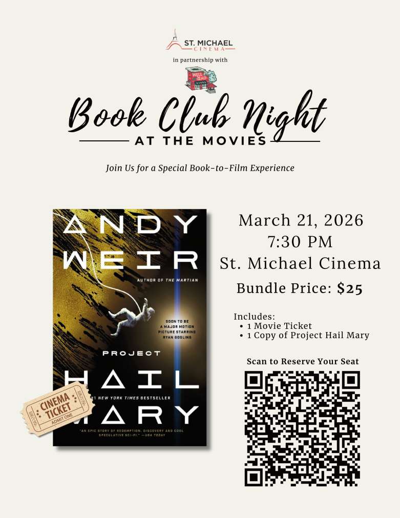 Join us for a special, bookish showing of the new movie “Project Hail Mary” at St. Michael Cinema. We will host a short book club discussion before the film and then enjoy the show together!